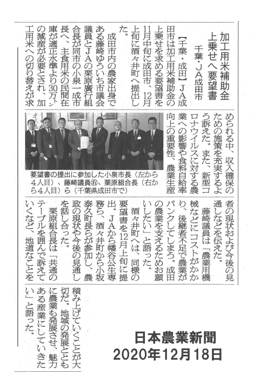 「飼料用米補助金」および「加工用米補助金」について補助金単価を確保するための要望書を提出