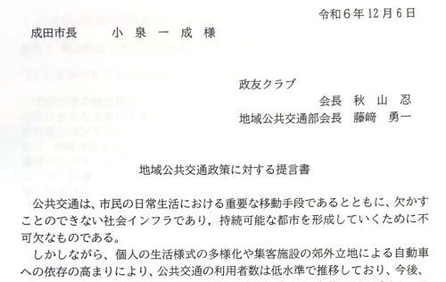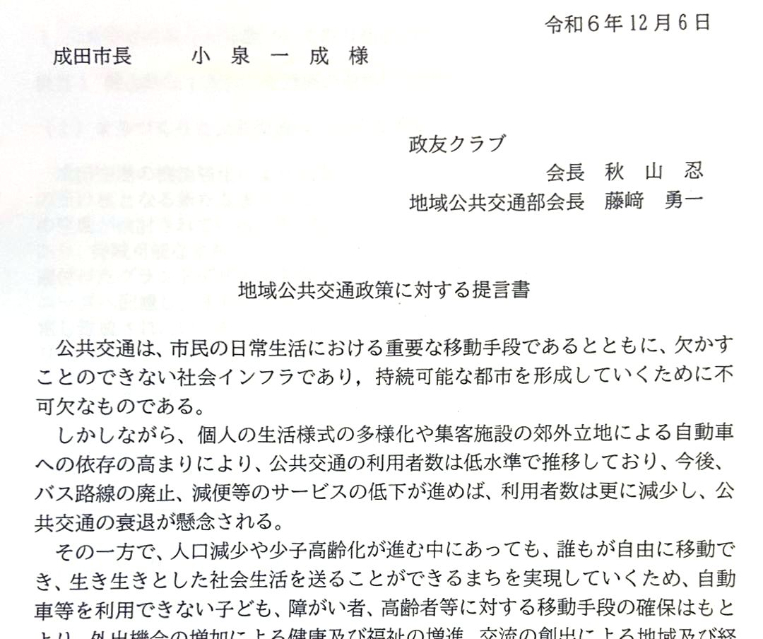 などの事例を踏まえ、本市の実情にあった公共交通政策の実現に向けて政友クラブとして意見をとりまとめ、小泉市長に提出しました。